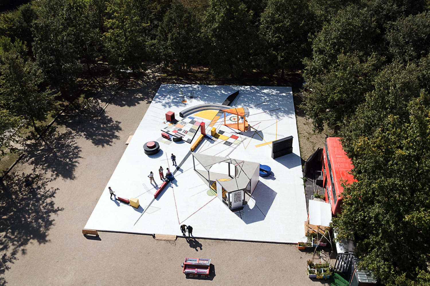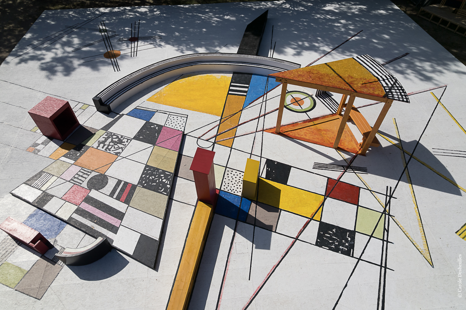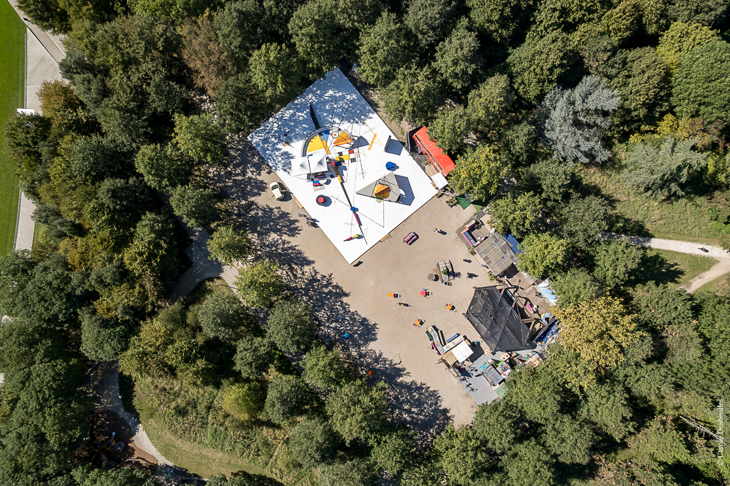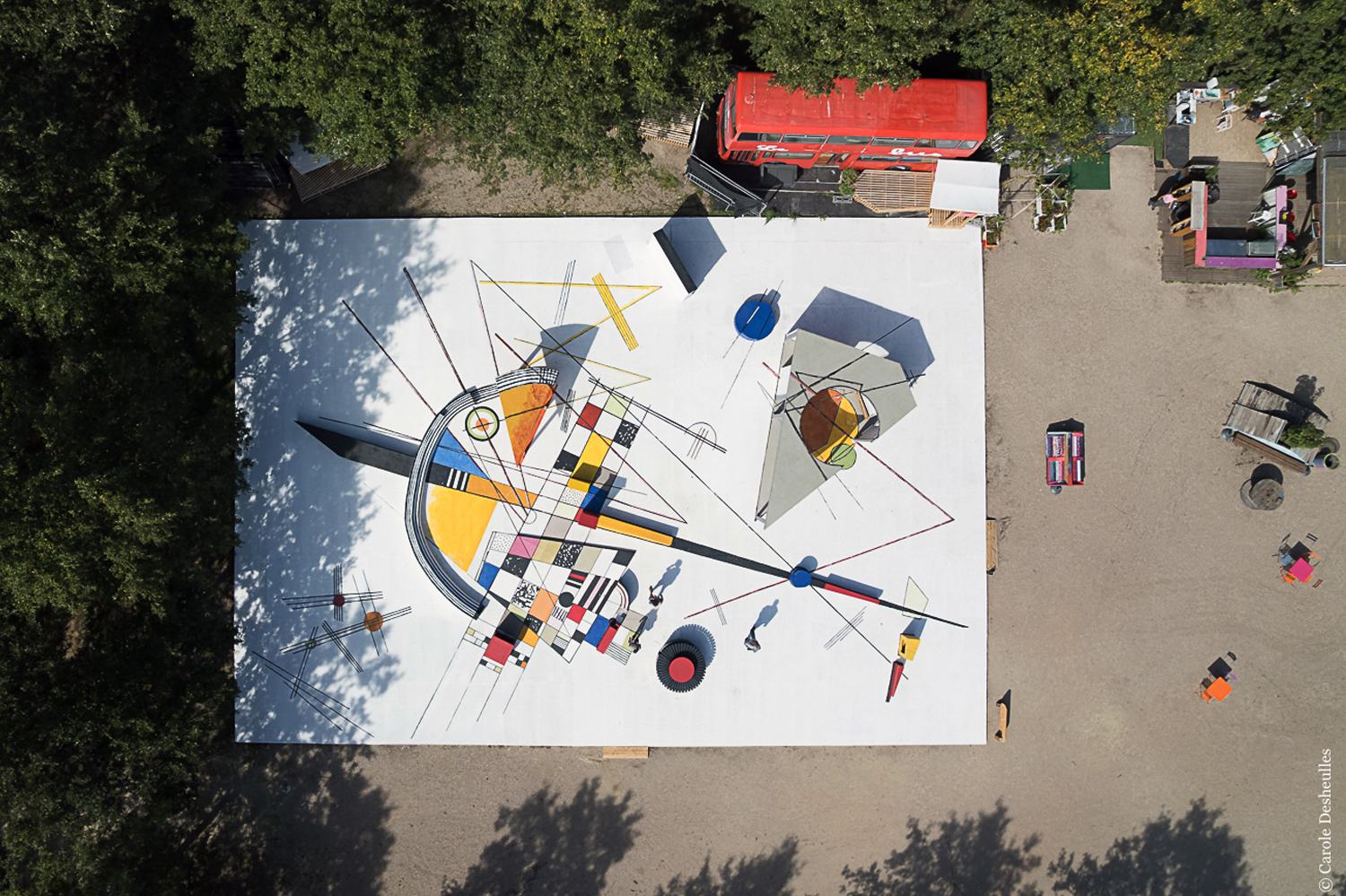 Grâce à ses prises de vue réalisées par drone, nous avons des images de l’installation artistique vue du ciel : le résultat est impréssionant ! Nous pouvons vraiment y apprécier la reproduction de l’oeuvre « Delicate Tension n85 » de Kandinsky ainsi que sa dimension plastique et monumentale !