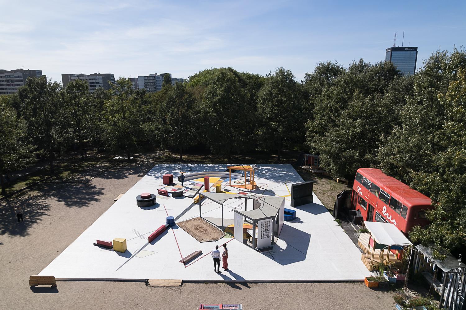 Pour rappel, ce projet a débuté en 2024 dans le but de réaliser une installation architecturale et artistique de 630 m². Il a été conçu par l’artiste et architecte Hocine Ali Benali, en collaboration avec l’association Au Milieu. Sa fabrication s’est déroulée dans le cadre de chantiers participatifs d’insertion professionnelle, à partir de matériaux de réemploi principalement issus des Jeux Olympiques de Paris 2024, grâce à Muto Events.