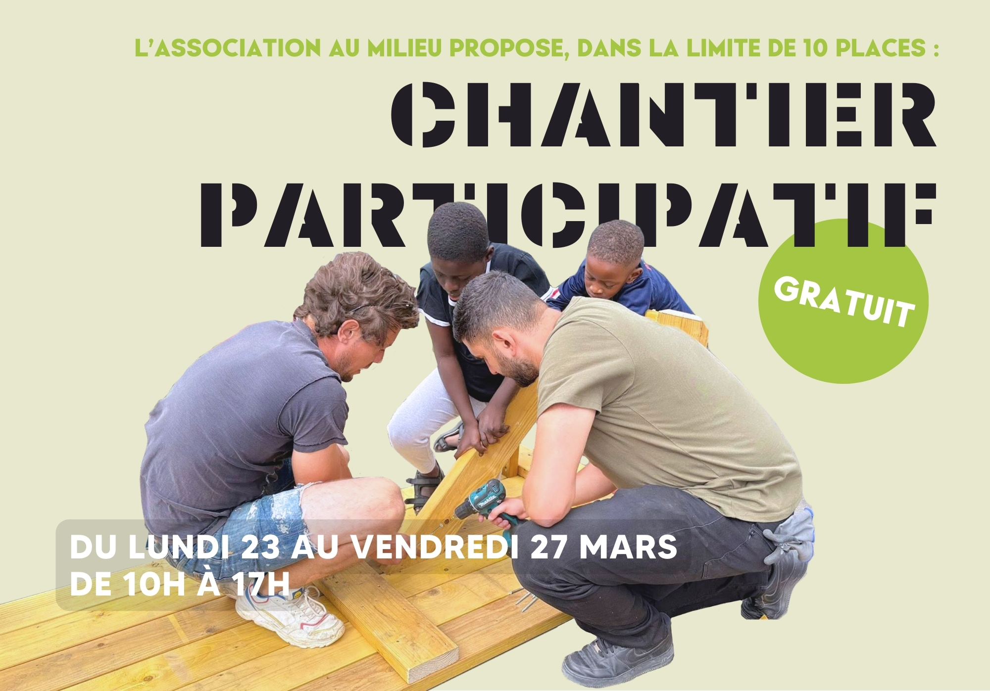 Notre première activité de l'année 2026 ! Au Milieu débute l'année avec son premier chantier participatif ce lundi 23 mars. Il s'agit d'une semaine de hashtag#formation en hashtag#menuiserie spécifiée dans le hashtag#réemploi de bois, ouverte à toutes et à tous mais prioritaire aux bénéficiaires du hashtag#RSA en hashtag#SeineSaintDenis L'objectif ? Réaménager la Cour Carrée en …